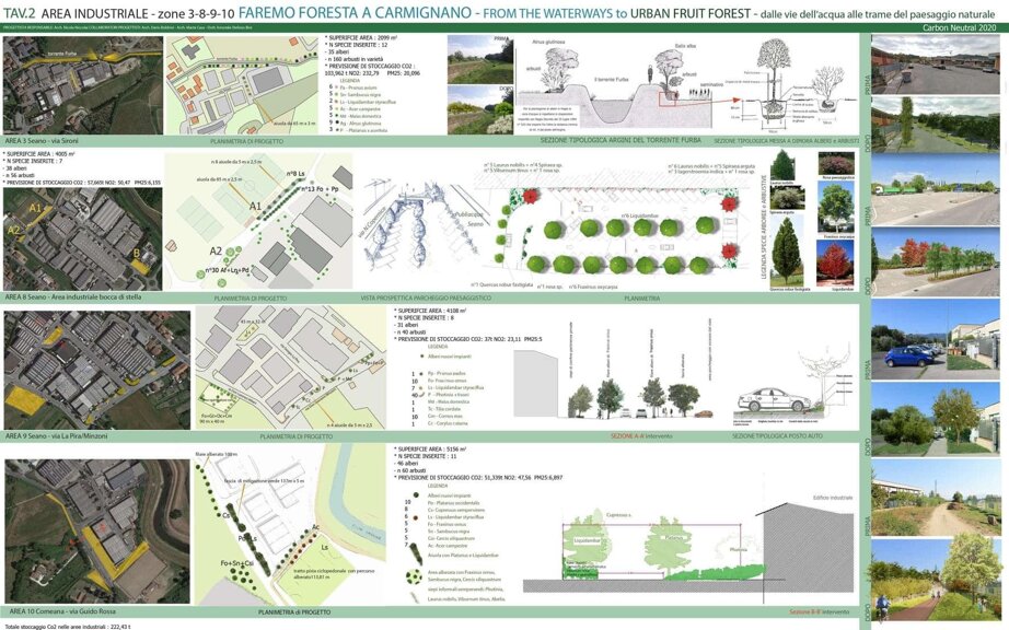 Riforestazione urbana nel Comune di Carmignano, grazie all'incarico per il progetto definitivo per la partecipazione al bando Toscana Carbon Neutral, messo in atto dalla Regione per abbattere drasticamente le emissioni di CO2 tramite nuove messe a dimora, in particolare nelle aree più urbanizzate ed industriali del territorio. Il progetto si chiama “Faremoforesta Carmignano” e nasce per il miglioramento e la cura dell’ambiente nel territorio comunale di Carmignano, in aree accuratamente selezionate che necessitano maggiormente di un intervento di piantagione alberi e rigenerazione degli spazi verdi pubblici. La sfida è emulare quei principi universali di ecologia che sostengono una struttura boschiva applicandoli di volta in volta alla scala definitiva dell’intervento così da ottenere a lavori compiuti maggior sostenibilità e resilienza del tutto. Per questo è stato scelto di non considerare una o poche aree verdi di intervento su cui mettere a dimora quanti più alberi possibile, ma piuttosto percorrere i tratti identitari del paesaggio di questo comune, selezionare porzioni di terreno in ambiti fortemente degradati, unirsi alle vie dell’acqua e alle presenze arboree esistenti, così da diversificare la tipologia di riforestazione urbana in base alle caratteristiche geomorfologiche e alle necessità ambientali. Il progetto segue le linee del progetto del Comune di Carmignano sulle vie dell’acqua, che rappresenta il punto di partenza per un piano che intreccia funzionalità urbanistica e valorizzazione ambientale. Seguendo questa visione parallela che da un lato vede lo sviluppo e la modernità di certe aree urbane che portano all’aumento dell’inquinamento e al crescente consumo di suolo, dall’altro invece la lungimiranza di certe scelte orientate alla sostenibilità e alla resilienza sociale e ambientale. Il progetto prevede la messa a dimora totale di 665 piante e si prevede che in 30 anni porterà all’assorbimento di 1260 tonnellate di CO2, 1335 chili di NO2 e 133 chili di PM2,5. Sono previste 4 macro-aree di intervento così definite: 1- AREA URBANA